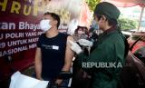 Tenaga kesehatan menyuntikkan vaksin COVID-19 kepada warga secara Drive Thru di Polres Metro Jakarta Selatan, Jakarta, Rabu (30/6). Polres Metro Jakarta Selatan menggelar kegiatan vaksinasi Covid-19 gratis dengan sistem drive thru dengan menyasar para pengguna kendaraan baik roda empat dan roda dua guna mempercepat target vaksinasi nasional untuk menekan lonjakan kasus COVID-19 di Indonesia. Prayogi/Republika (FOTO : Prayogi/Republika.)