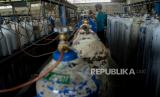 Petugas mengisi tabung oksigen cair di tempat pengisian oksigen Aneka Gas Industri di kawasan Cakung, Jakarta Timur, Rabu (30/6). Pemprov DKI Jakarta mengerahkan kendaraan dari berbagai Satuan Kerja Perangkat Daerah (SKPD) atau kedinasan di DKI Jakarta untuk mendistribusikan oksigen ke berbagai rumah sakit rujukan pasien Covid-19. Hal tersebut sebagai upaya mempercepat sirkulasi tabung oksigen yang sempat mengalami kelangkaan beberapa hari lalu akibat dari peningkatan harian kasus Covid-19 di DKI Jakarta. Republika/Thoudy Badai (FOTO : Republika/Thoudy Badai)