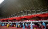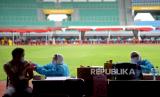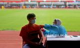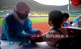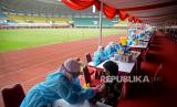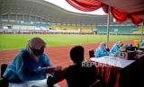 Suasana kegiatan vaksinasi massal di Stadion Patriot Chandrabhaga, Bekasi, Jawa Barat, Kamis (1/7). Pemerintah Kota (Pemkot) Bekasi menggelar vaksinasi massal untuk 25.000 peserta dengan sasaran warga Bekasi yang dibagi dua sesi yaitu pagi dan siang dalam satu hari. (FOTO : Prayogi/Republika)