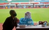 Tenaga kesehatan menyuntikkan vaksin COVID-19 kepada warga di Stadion Patriot Chandrabhaga, Bekasi, Jawa Barat, Kamis (1/7). Pemerintah Kota (Pemkot) Bekasi menggelar vaksinasi massal untuk 25.000 peserta dengan sasaran warga Bekasi yang dibagi dua sesi yaitu pagi dan siang dalam satu hari.Prayogi/Republika (FOTO : Prayogi/Republika.)
