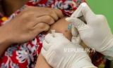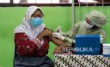 Tenaga kesehatan menyuntikan vaksin Covid-19 kepada pelajar di SMAN 20 Jakarta, Kamis (1/7). Vaksinasi Covid-19 tersebut diperuntukan bagi kalangan anak usia 12-17 tahun dan akan serentak dilakukan disetiap sekolah di DKI Jakarta sebagai upaya menekan penyebaran virus Covid-19. Republika/Thoudy Badai (FOTO : Republika/Thoudy Badai)
