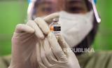 Tenaga kesehatan menunjukan tabung berisi vaksin Covid-19 di SMAN 20 Jakarta, Kamis (1/7). Vaksinasi Covid-19 tersebut diperuntukan bagi kalangan anak usia 12-17 tahun dan akan serentak dilakukan disetiap sekolah di DKI Jakarta sebagai upaya menekan penyebaran virus Covid-19. Republika/Thoudy Badai (FOTO : Republika/Thoudy Badai)