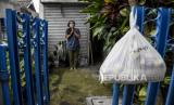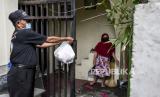 Kerabat dari warga yang melakukan isolasi mandiri COVID-19 menerima bantuan dari pengurus RW di rumahnya kawasan Cikutra, Bandung, Jawa Barat, Kamis (1/7/2021). Bantuan berupa sembako, vitamin dan obat-obatan dari Puskesmas hasil swadaya masyarakat kawasan tersebut diberikan kepada warga guna membantu kebutuhan saat isolasi mandiri COVID-19. (FOTO : ANTARA/Novrian Arbi)