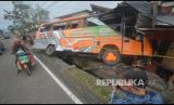 REPUBLIKA.CO.ID, TANAH DATAR -- Pengendara melihat kondisi bus yang menabrak rumah akibat disenggol sebuah truk di Panyalaian, Kabupaten Tanah Datar, Sumatera Barat, Jumat (2/7/2021).