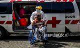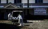 Petugas membawa pasien Covid-19 untuk dirawat di Rumah Sakit Lapangan Kota Bogor, Kompleks GOR Pajajaran, Kota Bogor, Jawa Barat, Jumat (2/7). Rumah Sakit Lapangan Kota Bogor kembali dioperasikan untuk menurunkan ketersediaan tempat tidur rumah sakit rujukan pasien Covid-19 di Kota Bogor pasca terjadinya lonjakan peningkatan kasus Covid-19. Rumah sakit tersebut sudah menerima 8 pasien Covid-19 rujukan dari RSUD Kota Bogor dengan kapasitas 18 tempat tidur untuk pasien covid-19 bergejala sedang. Republika/Putra M. Akbar (FOTO : Republika/Putra M. Akbar)