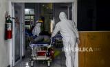 Petugas kesehatan membawa pasien Covid-19 untuk dirawat di Rumah Sakit Lapangan Kota Bogor, Kompleks GOR Pajajaran, Kota Bogor, Jawa Barat, Jumat (2/7). Rumah Sakit Lapangan Kota Bogor kembali dioperasikan untuk menurunkan ketersediaan tempat tidur rumah sakit rujukan pasien Covid-19 di Kota Bogor pasca terjadinya lonjakan peningkatan kasus Covid-19. Rumah sakit tersebut sudah menerima 8 pasien Covid-19 rujukan dari RSUD Kota Bogor dengan kapasitas 18 tempat tidur untuk pasien covid-19 bergejala sedang. Republika/Putra M. Akbar (FOTO : Republika/Putra M. Akbar)