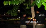 Petugas Satuan Polisi Pamong Praja (Satpol PP) memasang pita garis larangan melintas di kawasan wisata kota taman Sumber Wangi Kota Madiun, Jawa Timur, Sabtu (3/7/2021) malam. Pemkot Madiun menutup sejumlah kawasan dan memadamkan lampu penerangan jalan umum pada pukul 20.00 WIB untuk mengurangi mobilitas warga dalam rangka penerapan Pemberlakuan Pembatasan Kegiatan Masyarakat (PPKM) Darurat guna pengendalian penyebaran COVID-19. (FOTO : Antara/Siswowidodo)