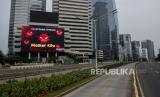 Suasana lengang pada hari kerja di kawasan bisnis Sudirman Thamrin saat penerapan PPKM Darurat di Jakarta, Senin, (5/7). Penyekatan jalan pada masa penerapan PPKM Darurat tersebut berlangsung dari 2 Juli hingga 20 Juli 2021 mendatang bertujuan untuk membatasi mobilitas warga Jabodetabek dalam rangka mencegah penyebaran Covid-19. Republika/Thoudy Badai (FOTO : Republika/Thoudy Badai)