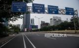 Suasana lengang pada hari kerja di kawasan bisnis Sudirman Thamrin saat penerapan PPKM Darurat di Jakarta, Senin, (5/7). Penyekatan jalan pada masa penerapan PPKM Darurat tersebut berlangsung dari 2 Juli hingga 20 Juli 2021 mendatang bertujuan untuk membatasi mobilitas warga Jabodetabek dalam rangka mencegah penyebaran Covid-19. (FOTO : Republika/Thoudy Badai)