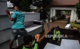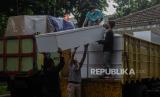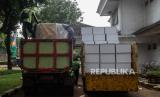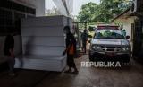 Petugas menurunkan peti jenazah covid-19 untuk didistribusikan ke rumah sakit di TPU Petamburan, Jakarta, Selasa (6/7). Pemprov DKI Jakarta melalui Dinas Pertamanan dan Hutan menyediakan peti jenazah secara gratis untuk rumah sakit dan pasien covid-19 di seluruh DKI Jakarta. Dalam satu hari sebanyak 100-200 peti jenazah didistribusikan ke sejumlah rumah sakit di DKI Jakarta. (FOTO : Republika/Thoudy Badai)
