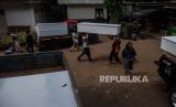 REPUBLIKA.CO.ID,JAKARTA -- Petugas menurunkan peti jenazah covid-19 untuk didistribusikan ke rumah sakit di TPU Petamburan, Jakarta, Selasa (6/7).