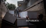 Petugas mengangkat peti jenazah covid-19 untuk didistribusikan ke rumah sakit di TPU Petamburan, Jakarta, Selasa (6/7). Pemprov DKI Jakarta melalui Dinas Pertamanan dan Hutan menyediakan peti jenazah secara gratis untuk rumah sakit dan pasien covid-19 di seluruh DKI Jakarta. Dalam satu hari sebanyak 100-200 peti jenazah didistribusikan ke sejumlah rumah sakit di DKI Jakarta. (FOTO : Republika/Thoudy Badai)