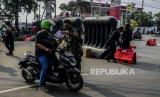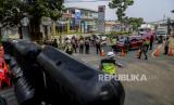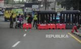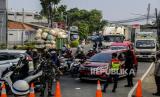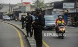 REPUBLIKA.CO.ID, DEPOK -- Sejumlah petugas gabungan berjaga saat melakukan penyekatan di Jalan Raya Bogor-Jakarta, Depok, Jawa Barat, Selasa (6/7).