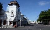 Suasana lengang di salah satu tempat yang biasa dipadati pengunjung di pusat Kota Bandung yaitu kawasan Pasar Baru, saat penutupan sementara di masa Pemberlakuan Pembatasan Kegiatan Masyarakat (PPKM) Darurat, Selasa (6/7). Penutupan sejumlah ruas jalan dan aktivitas perdagangan di pusat Kota Bandung, dalam rangka PPKM Darurat sebagai upaya mencegah penyebaran Covid-19. (FOTO : Edi Yusuf/Republika)
