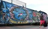 Warga mengenakan masker saat berjalan di dekat sebuah mural di Kota Ambon, Maluku, Rabu (7/7/2021). Berdasarkan data Satgas Percepatan Penanggulangan COVID-19 Maluku, per 7 Juli Kota Ambon kembali masuk ke zona merah atau risiko tinggi penularan COVID-19 dengan jumlah kasus kumulatif 1.082 orang sehingga Pemkot Ambon akan menerapkan Pemberlakuan Pembatasan Kegiatan Masyarakat (PPKM) Mikro mulai 8 hingga 21 Juli 2021. (FOTO : ANTARA /FB Anggoro)