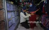 Orang tua menanyakan ukuran seragam sekolah untuk anaknya di toko perlengkapan sekolah Pasar Agung, Depok, Jawa Barat, Kamis (8/7). Pedagang seragam mengeluhkan sepinya omzet mereka pada tahun ajaran baru ini, menyusul masih diberlakukannya pembelajaran secara daring. Apalagi dengan kondisi pandemi dan diberlakukannya PPKM Darurat membuat Pembelajaran Tatap Muka (PTM) yang rencananya akan dimulai Juli ini kembali mengalami penundaan.Prayogi/Republika (FOTO : Prayogi/Republika.)
