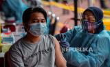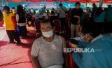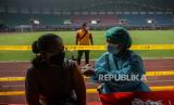 Tenaga kesehatan menyuntikan vaksin covid-19 Sinovac kepada warga saat vaksinasi massal di Stadion Patriot Chandrabhaga, Bekasi Selatan, Kota Bekasi, Jawa Barat, Kamis (8/7). Pemerintah Kota Bekasi menggelar vaksinasi massal sebanyak 50 ribu orang dalam sehari yang diperuntukan bagi kalangan usia 18 tahun keatas dan lansia sebagai upaya menciptakan kekebalan kelompok (herd immunity). (FOTO : Republika/Thoudy Badai)