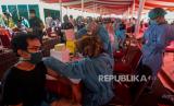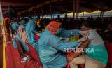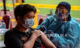 Tenaga kesehatan menyuntikan vaksin covid-19 Sinovac kepada warga saat vaksinasi massal di Stadion Patriot Chandrabhaga, Bekasi Selatan, Kota Bekasi, Jawa Barat, Kamis (8/7). Pemerintah Kota Bekasi menggelar vaksinasi massal sebanyak 50 ribu orang dalam sehari yang diperuntukan bagi kalangan usia 18 tahun keatas dan lansia sebagai upaya menciptakan kekebalan kelompok (herd immunity). Republika/Thoudy Badai (FOTO : Republika/Thoudy Badai)