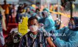 Warga mengantre sebelum menjalani vaksin covid-19 Sinovac saat vaksinasi massal di Stadion Patriot Chandrabhaga, Bekasi Selatan, Kota Bekasi, Jawa Barat, Kamis (8/7). Pemerintah Kota Bekasi menggelar vaksinasi massal sebanyak 50 ribu orang dalam sehari yang diperuntukan bagi kalangan usia 18 tahun keatas dan lansia sebagai upaya menciptakan kekebalan kelompok (herd immunity). (FOTO : Republika/Thoudy Badai)