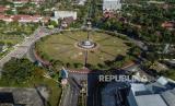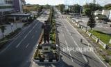 REPUBLIKA.CO.ID, PALANGKARAYA -- Foto udara suasana sepi di simpang enam bundaran besar saat penutupan ruas jalan pusat kota Palangkaraya, Kalimantan Tengah, Jumat (9/7/2021). Penutupan sejumlah ruas titik jalan protokol di pusat kota tersebut untuk mengurangi pergerakan mobilitas dan penegakan aturan Pemberlakuan Pembatasan Kegiatan Masyarakat (PPKM) Mikro guna menekan angka penularan COVID-19 yang semakin meningkat.