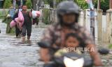 Sejumlah warga melintasi genangan banjir di Desa Lampasie Engking, Kecamatan Darul Imarah, Aceh Besar, Aceh, Jumat (9/7/2021). Banjir yang disebabkan tingginya intensitas hujan itu mengakibatkan puluhan rumah warga terendam banjir dengan ketinggian air 30 cm - 90 cm dan sebagian warga terpaksa mengungsi kerumah tetangganya. (FOTO : ANTARA/Syifa Yulinnas)
