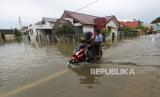 REPUBLIKA.CO.ID, ACEH BESAR -- Pengendara sepeda motor melintasi genangan banjir di Desa Lampasie Engking, Kecamatan Darul Imarah, Aceh Besar, Aceh, Jumat (9/7/2021). Banjir yang disebabkan tingginya intensitas hujan itu mengakibatkan puluhan rumah warga terendam banjir dengan ketinggian air 30 cm - 90 cm dan sebagian warga terpaksa mengungsi kerumah tetangganya.