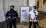 Menteri Badan Usaha Milik Negara (BUMN) Erick Thohir (kiri) didampingi Direktur Utama PT Bio Farma Honesti Basyir (kanan) menyampaikan keterangan pers saat kunjungan kerja di PT Bio Farma (Persero), Jalan Pasteur, Kota Bandung, Sabtu (10/7). Dalam kunjungan kerjanya di Bandung, Erick Thohir berkesempatan untuk memantau dan memastikan proses pendistribusian vaksin Covid-19 serta vaksin lainnya di PT Bio Farma terpantau secara baik sekaligus meninjau pelaksanaan vaksinasi Covid-19 di Stasiun Bandung. (FOTO : REPUBLIKA/ABDAN SYAKURA)