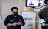 Menteri Badan Usaha Milik Negara (BUMN) Erick Thohir menyampaikan keterangan pers saat kunjungan kerja di PT Bio Farma (Persero), Jalan Pasteur, Kota Bandung, Sabtu (10/7). Dalam kunjungan kerjanya di Bandung, Erick Thohir berkesempatan untuk memantau dan memastikan proses pendistribusian vaksin Covid-19 serta vaksin lainnya di PT Bio Farma terpantau secara baik sekaligus meninjau pelaksanaan vaksinasi Covid-19 di Stasiun Bandung. (FOTO : REPUBLIKA/ABDAN SYAKURA)