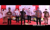 Ateng Rivai, Direktur Kepatuhan Bank DKI, Ahmad Ghiffari, Kabid Usaha Transportasi, Properti dan Keuangan BP BUMD Provinsi DKI Jakarta, Romy Wijayanto, Direktur Keuangan merangkap Plt Direktur Utama Bank DKI, Dhani Gunawan Idat, Kepala OJK Kantor Regional 1 DKI Jakarta dan Banten, Kamrussamad, Anggota Komisi XI DPR RI, Wijayanto Samirin, Tim Gubernur Untuk Percepatan Pembangunan (TGUPP) Provinsi DKI Jakarta, Babay Parid Wazdi Direktur Kredit UMK & Usaha Syariah Bank DKI, berikrar mendukung program Sentra Vaksinasi nasional saat lakukan kunjungan di Sentra Vaksin Bank DKI di Kantor Layanan Juanda di Jakarta (10/07). (FOTO : Bank DKI )