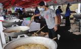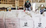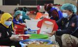 REPUBLIKA.CO.ID, KALIBATA -- Sejumlah petugas melakukan proses pengemasan makanan di dapur umum Kementerian Sosial di halaman gedung konvensi, Taman Makan Pahlawan Nasional Utama (TMPNU), Kalibata, Jakarta, Sabtu (10/7). Sebanyak 15.000-20.000 makanan disiapkan untuk tenaga kesehatan, petugas penyekatan PPKM dan petugas Taman Pemakaman Umum (TPU) di wilayah Jakarta.