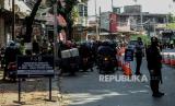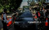Petugas Kepolisian saat berjaga di posko penyeketan Lenteng Agung, Jakarta, Senin (12/7). Pemerintah Provinsi DKI Jakarta menetapkan Kebijakan bagi warga yang bekerja di sektor essensial, kritikal atau dalam keadaan mendesak untuk membawa Surat Tanda Registrasi Pekerja (STRP) sebagai dokumen persayaratan perjalanan pada masa PPKM Darurat hingga 20 Juli 2021 mendatang. Republika/Thoudy Badai (FOTO : Republika/Thoudy Badai)