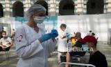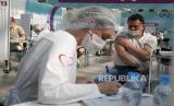 petugas kesehatan bersiap memberikan suntikan vaksin virus corona di pusat vaksinasi di Gostinny Dvor, Moskow, Rusia, Senin (12/7). Rusia menghadapi peningkatan tajam penularan dalam beberapa pekan terakhir, dengan infeksi baru setiap hari meningkat dari sekitar 9.000 pada awal Juni menjadi lebih dari 25.000 pada hari Jumat. Foto AP/Pavel Golovkin (FOTO : AP)