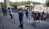 Orang-orang, beberapa dari mereka orang asing yang bekerja di Rusia, tiba di pusat vaksinasi di Kompleks Olimpiade Luzhniki di Moskow, Rusia, Kamis, 8 Juli 2021. (FOTO : AP/Alexander Zemlianichenko)
