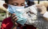Seorang anak bermain dengan domba kurban yang dipasangi masker oleh pedagang saat dijual di Jalan Babakan Loa, Cimahi Utara, Kota Cimahi, Selasa (13/7). Aksi tersebut bertujuan untuk menarik minat pembeli sekaligus sebagai bentuk kampanye protokol kesehatan pencegahan Covid-19 salah satunya dengan menggunakan masker. Foto: Republika/Abdan Syakura (FOTO : REPUBLIKA/ABDAN SYAKURA)