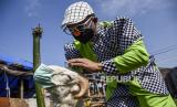 Pedagang menggunakan kostum badut memasangkan masker pada domba yang dijual untuk keperluan kurban di Jalan Babakan Loa, Cimahi Utara, Kota Cimahi, Selasa (13/7). Aksi tersebut bertujuan untuk menarik minat pembeli sekaligus sebagai bentuk kampanye protokol kesehatan pencegahan Covid-19 salah satunya dengan menggunakan masker (FOTO : REPUBLIKA/ABDAN SYAKURA)