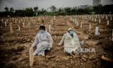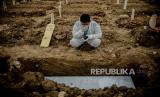 Keluarga memanjatkan doa saat prosesi pemakaman jenazah pasien Covid-19 di TPU khusus Covid-19 Rorotan, Jakarta Utara, Selasa (13/7). Berdasarkan data Worldometers pada Selasa 13 Juli 2021 Indonesia menjadi negara dengan angka kasus harian terbanyak dengan penambahan kasus positif 40..427 orang dan angka kematian tertinggi di dunia bertambah 891 orang. (FOTO : Republika/Thoudy Badai)