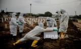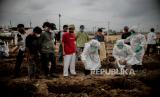 Petugas melakukan prosesi pemakaman pasien Covid-19 di TPU khusus Covid-19 Rorotan, Jakarta Utara, Selasa (13/7). Berdasarkan data Worldometers pada Selasa 13 Juli 2021 Indonesia menjadi negara dengan angka kasus harian terbanyak dengan penambahan kasus positif 40..427 orang dan angka kematian tertinggi di dunia bertambah 891 orang.  (FOTO : Republika/Thoudy Badai)