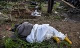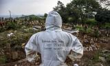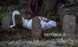 Petugas mengenakan alat pelindung diri (APD) berisitirahat disela prosesi pemakaman protokol Covid-19 di TPU Cikadut, Jalan Cikadut, Mandalajati, Kota Bandung, Selasa (13/7). Berdasarkan hasil data yang dihimpun dari situs pikobar.jabarprov.go.id hingga (13/7) pukul 18.30 WIB tercatat kasus terkonfirmasi Covid-19 di Jawa Barat sudah mencapai 459.949 kasus dan angka kematian akibat Covid-19 sebanyak 6.616 orang sementara jumlah pasien yang dinyatakan sembuh mencapai 360.652 kasus. (FOTO : REPUBLIKA/ABDAN SYAKURA)