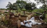 Sejumlah petugas mengenakan alat pelindung diri (APD) berisitirahat disela prosesi pemakaman protokol Covid-19 di TPU Cikadut, Jalan Cikadut, Mandalajati, Kota Bandung, Selasa (13/7). Berdasarkan hasil data yang dihimpun dari situs pikobar.jabarprov.go.id hingga (13/7) pukul 18.30 WIB tercatat kasus terkonfirmasi Covid-19 di Jawa Barat sudah mencapai 459.949 kasus dan angka kematian akibat Covid-19 sebanyak 6.616 orang sementara jumlah pasien yang dinyatakan sembuh mencapai 360.652 kasus. (FOTO : REPUBLIKA/ABDAN SYAKURA)