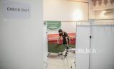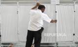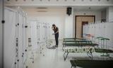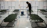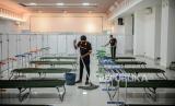 Petugas membersihkan ruang isolasi pasien Covid-19 di Gelanggang Olahraga Remaja Matraman, Jakarta Timur, Rabu (14/7). Gor Matraman akan dijadikan tempat isolasi pasien Covid-19 dengan status Orang Tanpa Gejala (OTG) dengan daya tampung sebanyak 50 orang. (FOTO : Republika/Thoudy Badai)