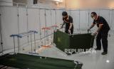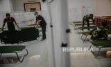 Petugas merapikan ranjang lipat untuk ruang isolasi pasien Covid-19 di Gelanggang Olahraga Remaja Matraman, Jakarta Timur, Rabu (14/7). Gor Matraman akan dijadikan tempat isolasi pasien Covid-19 dengan status Orang Tanpa Gejala (OTG) dengan daya tampung sebanyak 50 orang. (FOTO : Republika/Thoudy Badai)
