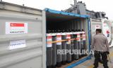 REPUBLIKA.CO.ID, JAKARTA -- Petugas berusaha menurunkan Oxygen Cylinders dari kapal perang Singapura, RSS Endeavour-210 di Pelabuhan Tanjung Priok, Jakarta, Rabu (14/7/2021).