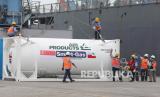 Petugas berusaha menurunkan Oxygen Cylinders dari kapal perang Singapura, RSS Endeavour-210 di Pelabuhan Tanjung Priok, Jakarta, Rabu (14/7/2021). RSS Endeavour-210 membawa bantuan dan dukungan dari pemerintah Singapura untuk mempercepat penanggulangan pandemi COVID-19 di Indonesia berupa Filled 250 X 50L Oxygen Cylinders, Iso Tank, Oxygen Concentrattors, Oxygen Concentrators Accessories. (FOTO : Antara/Hiro)