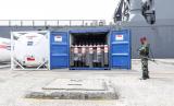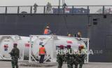 Prajurit Korps Marinir TNI AL berdiri di depan iso tank yang baru diturunkan dari kapal perang Singapura, RSS Endeavour-210 di Pelabuhan Tanjung Priok, Jakarta, Rabu (14/7/2021). RSS Endeavour-210 membawa bantuan dan dukungan dari pemerintah Singapura untuk mempercepat penanggulangan pandemi COVID-19 di Indonesia berupa Filled 250 X 50L Oxygen Cylinders, Iso Tank, Oxygen Concentrattors, Oxygen Concentrators Accessories. (FOTO : Antara/Hiro)