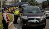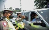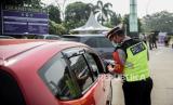 Petugas Kepolisian melakukan pemeriksaan Surat Tanda Registrasi Pekerja (STRP) atau surat tugas pengemudi yang akan melintas di Tol Tambun, Kabupaten Bekasi, Jawa Barat, Kamis (15/7). Sebanyak sembilan titik penyekatan dilaksanakan di ruas Tol Jakarta-Cikampek sebagai upaya menekan laju mobilitas masyarakat pada masa PPKM Darurat guna menekan angka penyebaran Covid-19. (FOTO : Republika/Thoudy Badai)