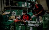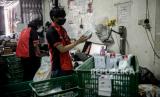 Pekerja menyortir paket obat Covid-19 di salah satu gerai ekspedisi Sicepat di Jalan K.S Tubun, Petamburan, Jakarta, Sabtu (17/7). Pemerintah Pusat resmi mendistribusikan obat Covid-19 secara gratis sebanyak 300.000 paket berupa multivitamin, Azithtromycin, dan Oseltamivir bagi pasien COVID-19 yang menjalani isolasi mandiri di Pulau Jawa dan Bali yang dikirim melalui jasa layanan ekspedisi. Reublika/Thoudy Badai (FOTO : Republika/Thoudy Badai)
