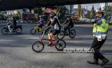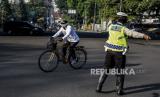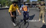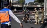 REPUBLIKA.CO.ID, BANDUNG -- Petugas gabungan menghalau pesepeda saat operasi penyekatan di Jalan Ir H Juanda, Kota Bandung, Ahad (18/7). Penyekatan tersebut merupakan tindak lanjut dari penerapan Pemberlakuan Pembatasan Kegiatan Masyarakat (PPKM) Darurat, untuk menekan mobilitas masyarakat dan mencegah kerumunan untuk meminimalisir penyebaran Covid-19.