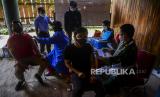 Sejumlah warga saat disuntik vaksin Covid-19 di Kampung Budaya Betawi Setu Babakan, Jagakarsa, Jakarta, Ahad (18/7). Kegiatan serbuan vaksinasi dengan kuota 1.000 orang itu untuk mempercepat program vaksin bagi rakyat Indonesia agar tercipta kekebalan komunal. (FOTO : Republika/Putra M. Akbar)