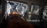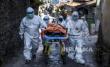 Petugas Public Safety Center 119 (PSC 119) bersama petugas puskesmas mengevakuasi jenazah pasien Covid-19 yang meninggal saat isolasi mandiri (isoman) di rumahnya di Jalan Cibarengkok, Sukajadi, Kota Bandung, Ahad (18/7). Berdasarkan hasil data yang dihimpun dari situs covid19.bandung.go.id hingga (17/7) pukul 19.09 WIB tercatat kasus terkonfirmasi Covid-19 di Kota Bandung sudah mencapai 31.175 kasus dan angka kematian akibat Covid-19 sebanyak 835 orang sementara jumlah pasien yang dinyatakan sembuh mencapai 23.734 kasus. (FOTO : REPUBLIKA/ABDAN SYAKURA)