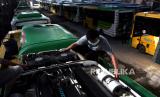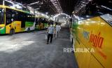 Pekerja melakukan perawatan bus Trans Jogja di garasi bus Trans Jogja, Gamping, Sleman, D.I Yogyakarta, Ahad (18/7/2021). PT Anindya Mitra International (AMI) memberhentikan operasi bus Trans Jogja mulai 18 Juli 2021 hingga berakhirnya PPKM Darurat guna menekan mobilitas masyarakat. (FOTO : ANTARA/Andreas Fitri Atmoko)